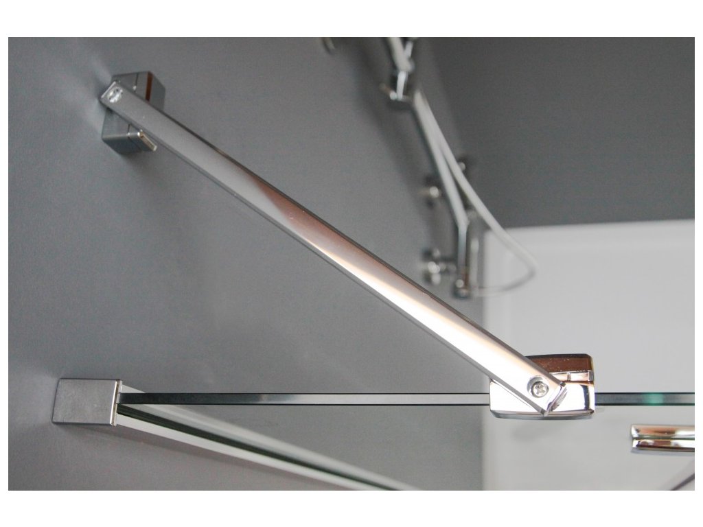 | Praktické madlo z nerez oceli pro pohodlé otevírání dveří. Uvnitř minimalistický knob, který nezabírá téměř žádné místo. | Pochromované panty, dovolují plné otevření dveří o v úhlu téměř 160° | Stěnové nerovnosti se vyrovnává zasnutím skla do stěnového profilu. | Vzpěra nastavitelná ve dvou bodech dodává zástěnam potřebnou stabilitu. |