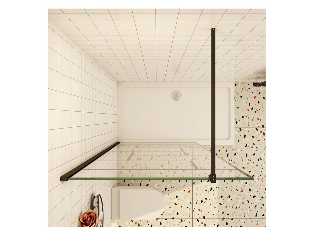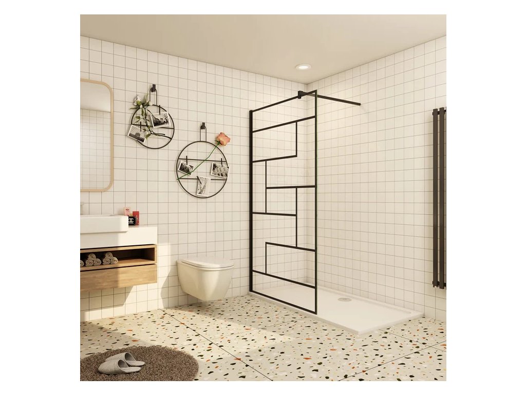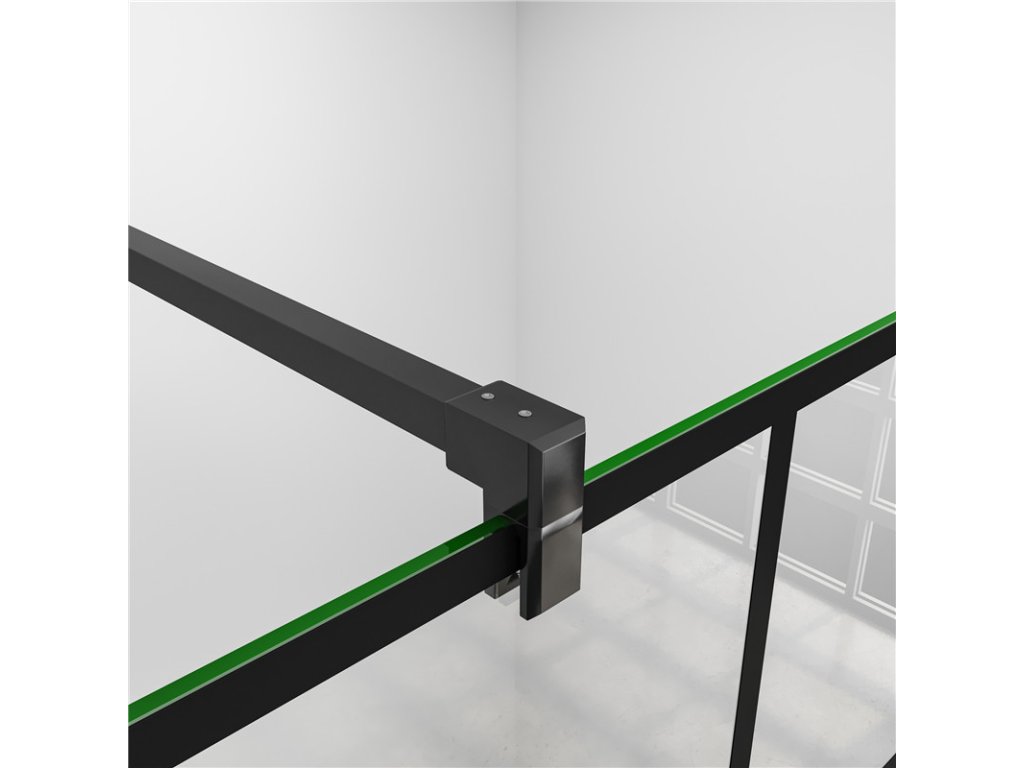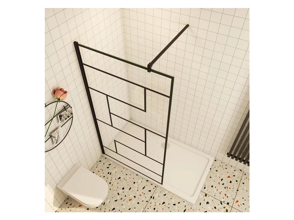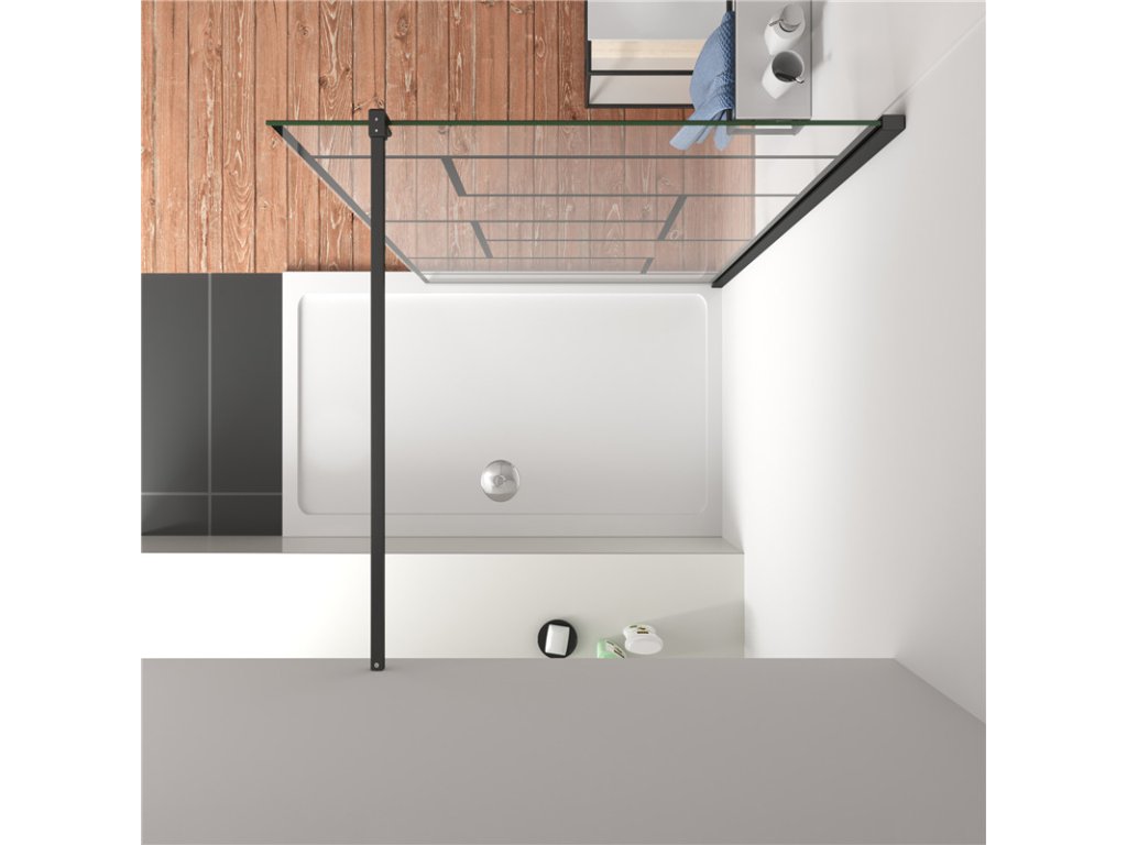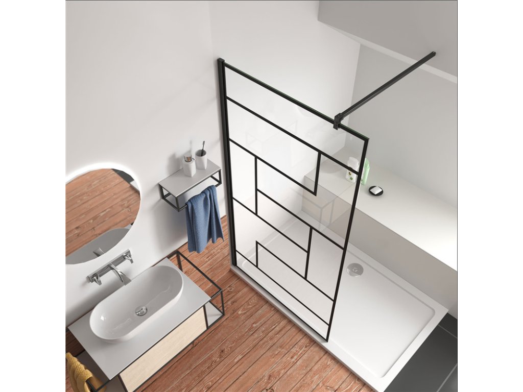 WALKY LINE BLACK MODERNIST bezdveřové sprchové zástěny pro pohodlné sprchování ve volném prostoru odděleni jen 8mm čirým sklem s černými obrazci pro moderní vzhled. Stabilitu zajišťuje kolmá vzpěra, zkracovatelná dle potřeby v délkách 900mm a 1400mm.
